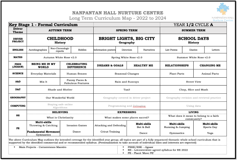 In addition to the Cornerstone Maestro Curriculum, the Nurture Centre also uses a number of recognised schemes of work to support teacher workload including 'White Rose' for Maths and 'Jigsaw' for PSHE/RSE.
